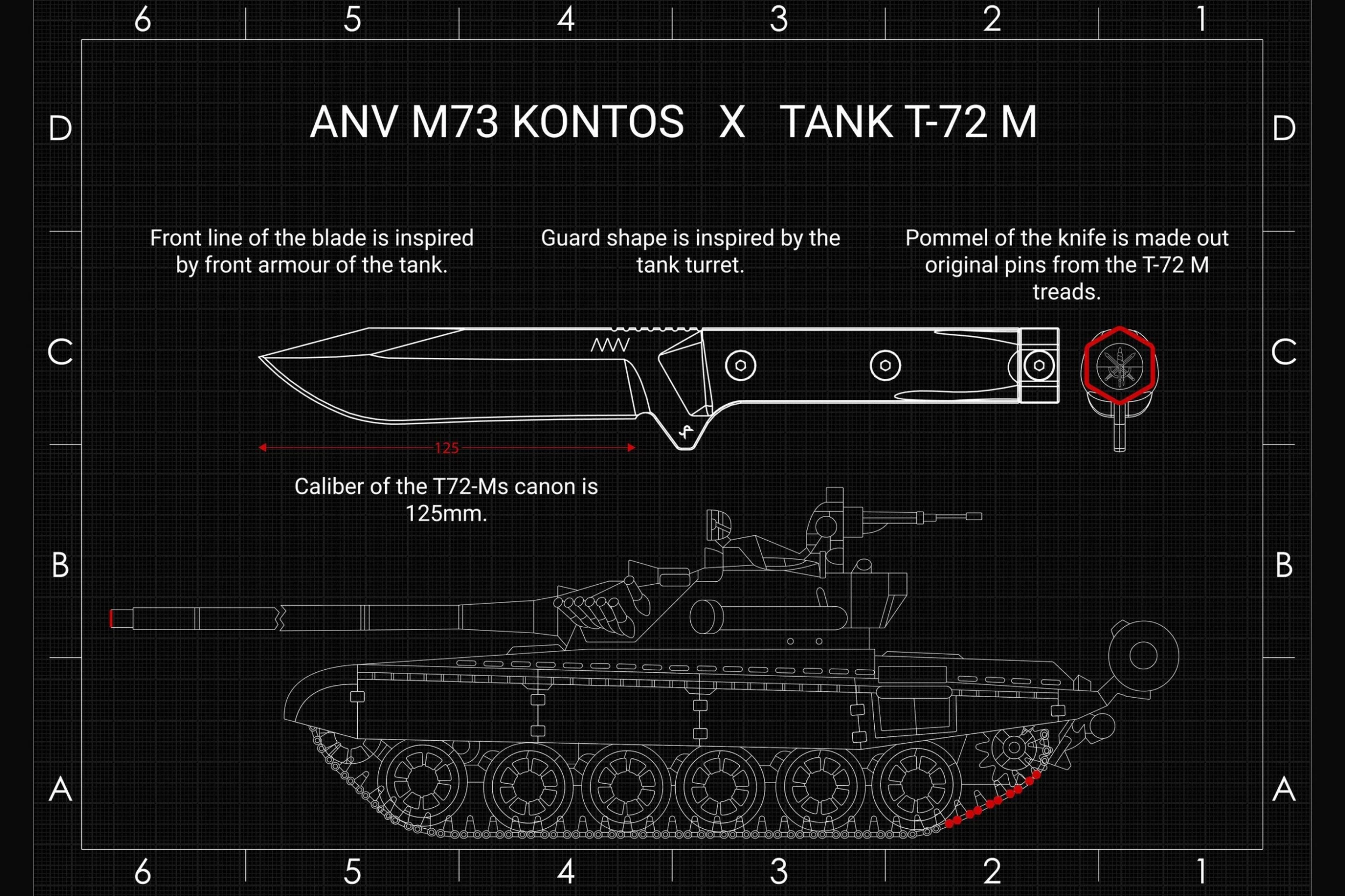 El ANV M73 Kontos es un cuchillo fijo extraordinario, diseñado en cooperación con el 73º Batallón de Tanques de las Fuerzas Armadas Checas. La forma de la hoja puede recordar a la parte delantera del tanque T-72M. De hecho: el pomo, también llamado butt capestá fabricado a partir de un pasador original de las orugas de un tanque T-72. ¡Tan único! Además, el protector tiene la misma forma que la cúpula de ese tanque. La primera edición numerada del M73 Kontos se entregó a los miembros del 73º batallón de tanques y no está a disposición del público. Con esta versión del Kontos, el M73 está al alcance de todos.