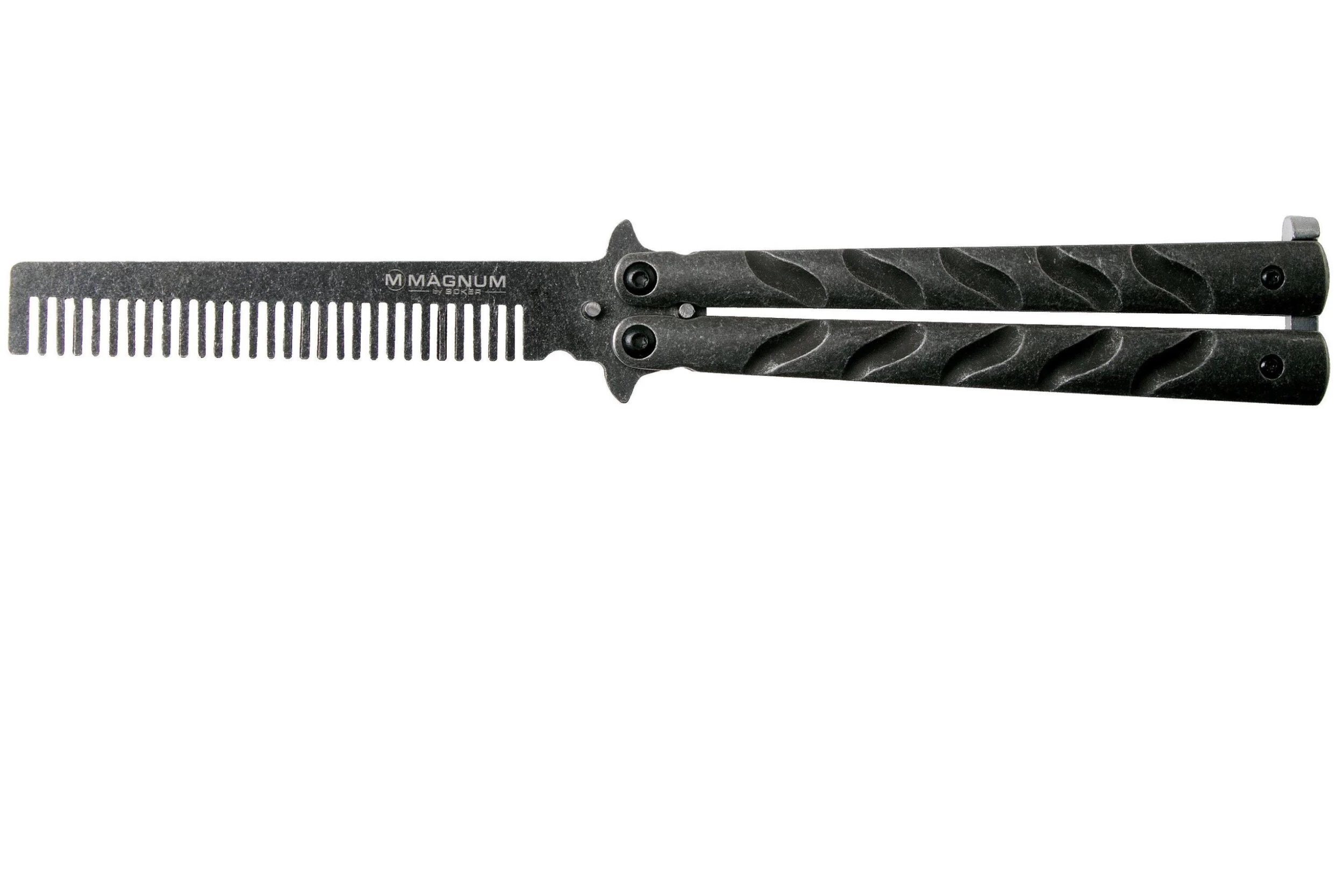 El Böker Magnum Balicomb 09MB252 es un peine plegable, basado en un balisong. El balisong a veces se denomina también cuchillo mariposa. En lugar de una hoja, y por lo tanto de un cuchillo, el Balicomb está mejorado con un peine. Así que un «peine mariposa». Como tal, el Balicomb es legal de poseer, llevar y usar. El regalo perfecto para cualquier persona con barba, o una práctica versión de entrenamiento para sustituir un balisong real.