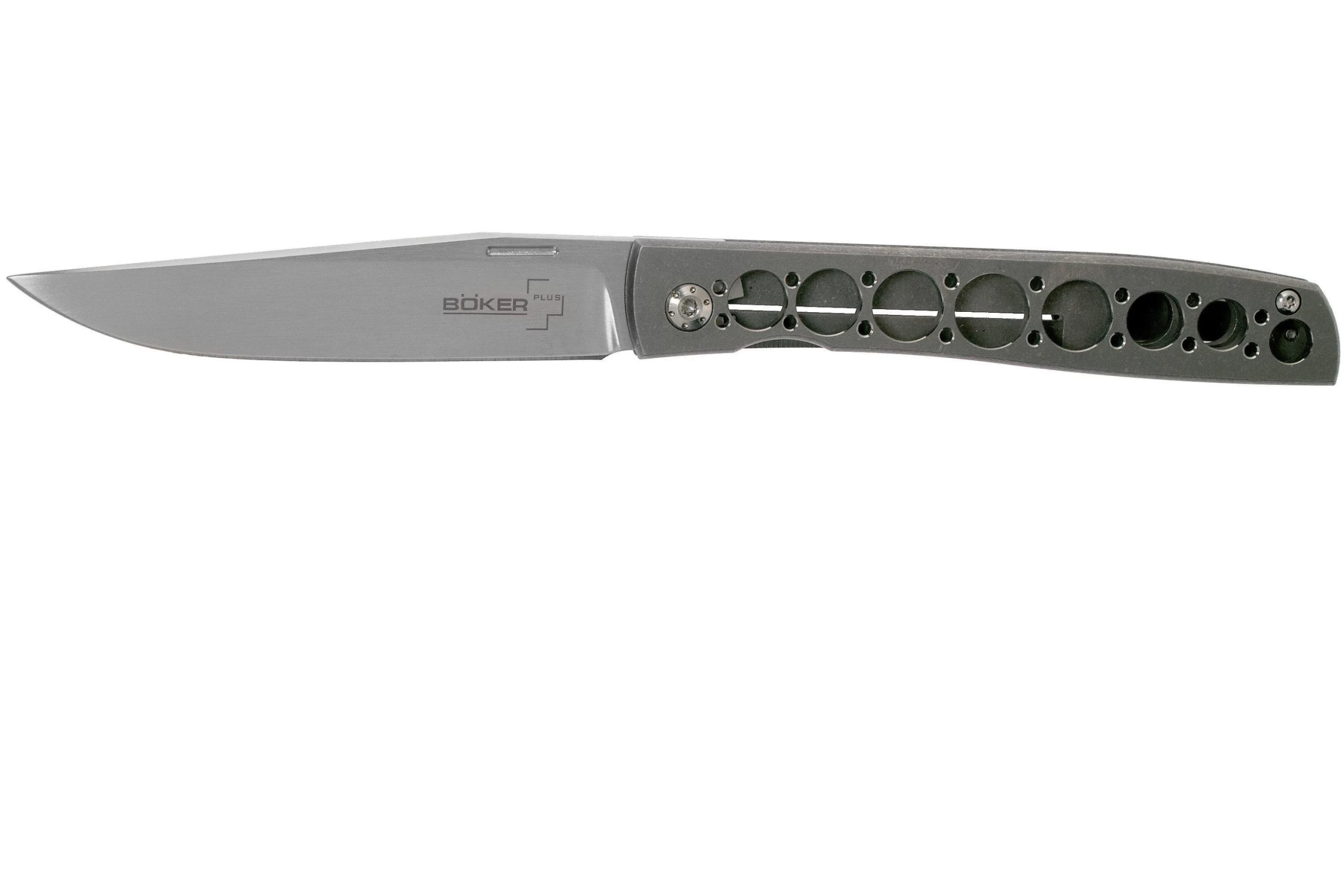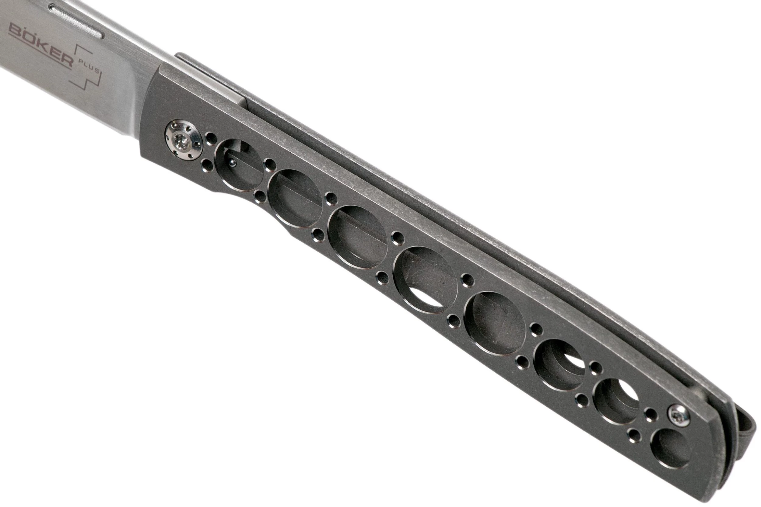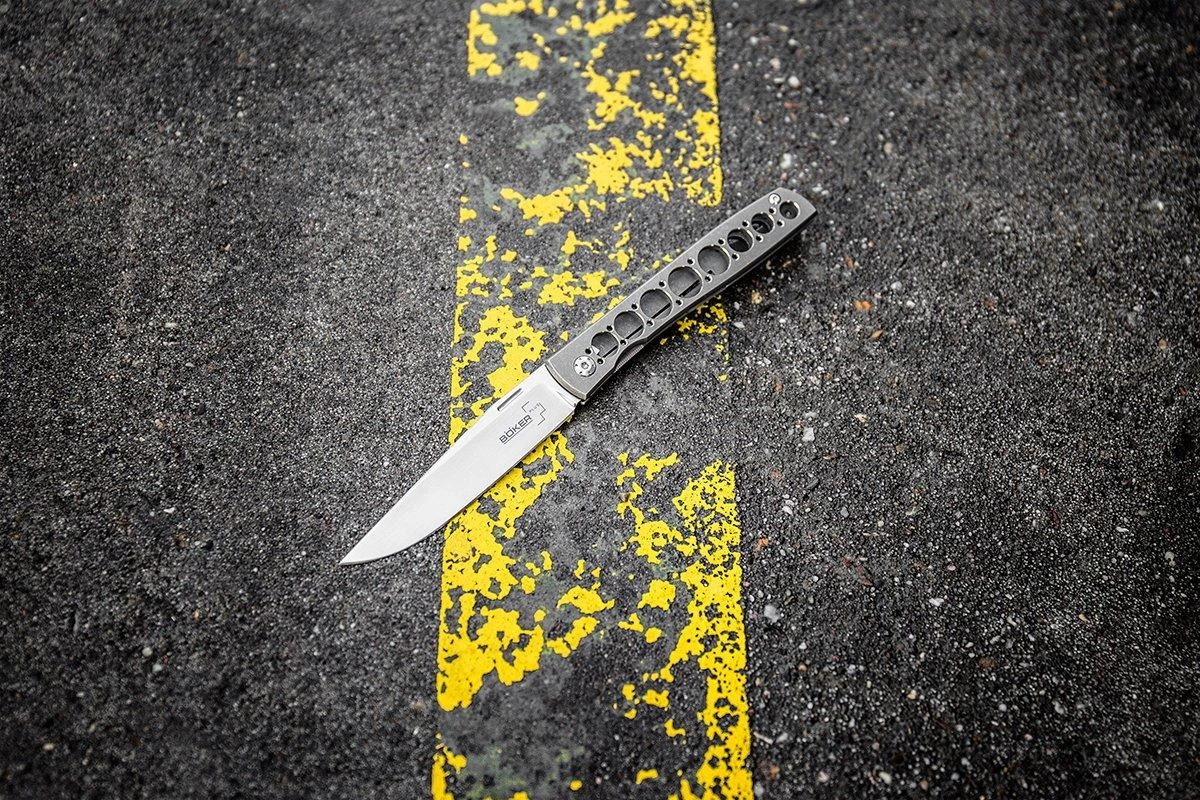 La Böker Plus Urban Trapper 42 es una navaja muy fina y elegante, diseñada por Brad Zinker. Debido a su pequeño tamaño y a la estructura de titanio, este cuchillo no pesa casi nada. En comparación con las otras versiones de la Urban Trapper, esta navaja no se puede abrir con una sola mano. Cuando se abre, la hoja queda bloqueada por el framelock.