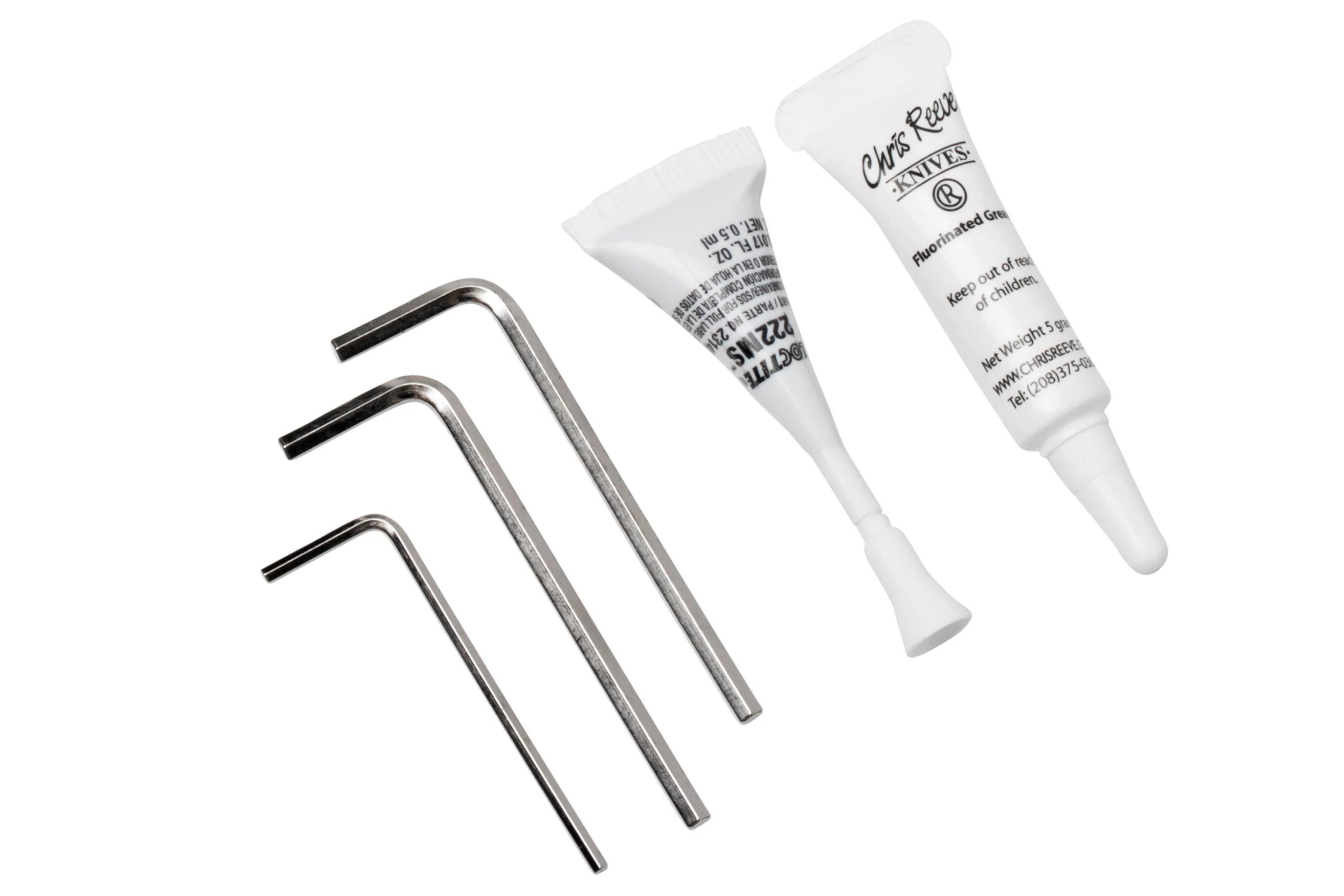 Este Chris Reeve Service Kit es un práctico kit de mantenimiento para el Chris Reeve Inkosi, Umnumzaan, TiLock y Sebenza 25. Este juego contiene un paño de microfibra, grasa fluorada, loctite y una o varias llaves Allen según el modelo de cuchillo CRK.