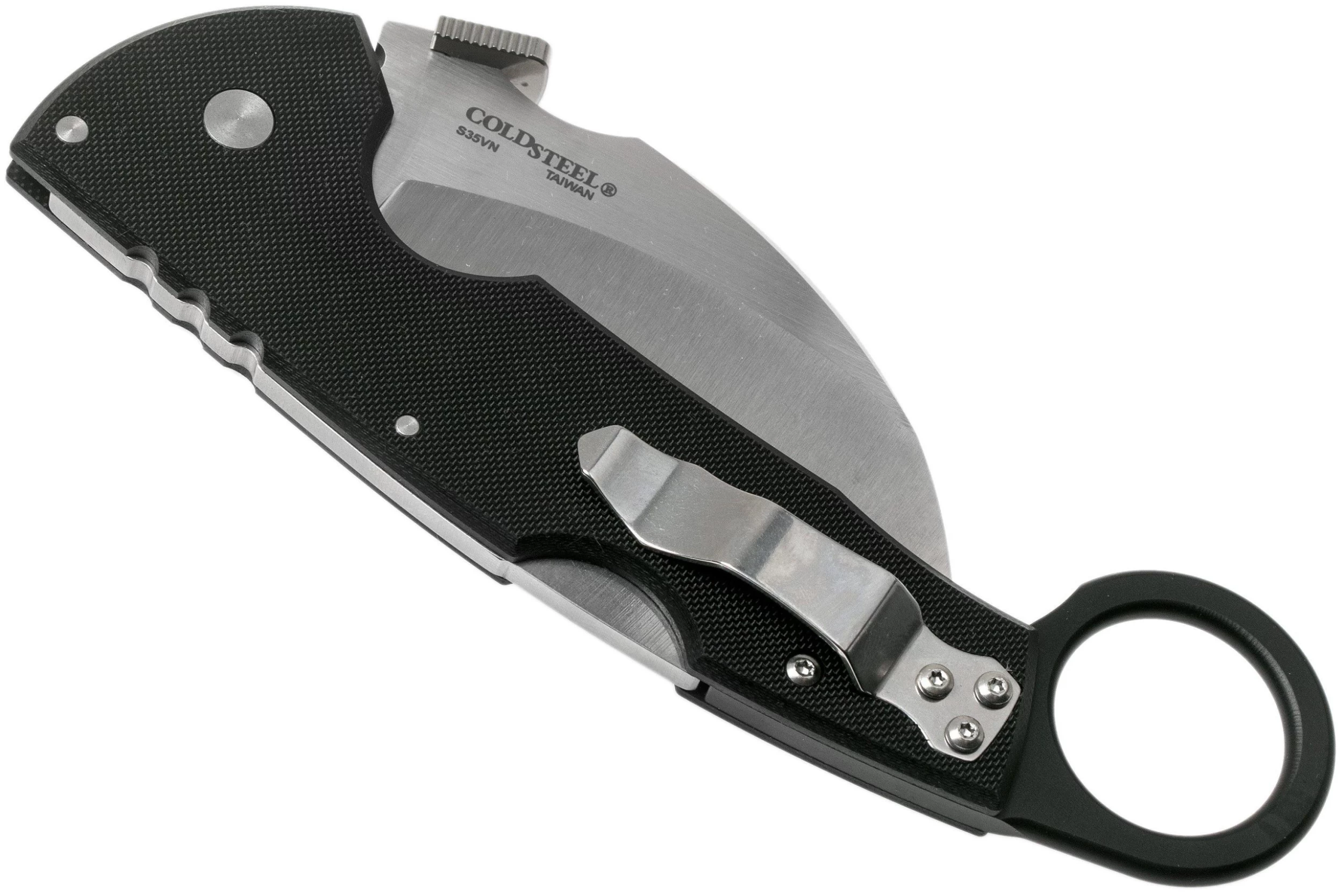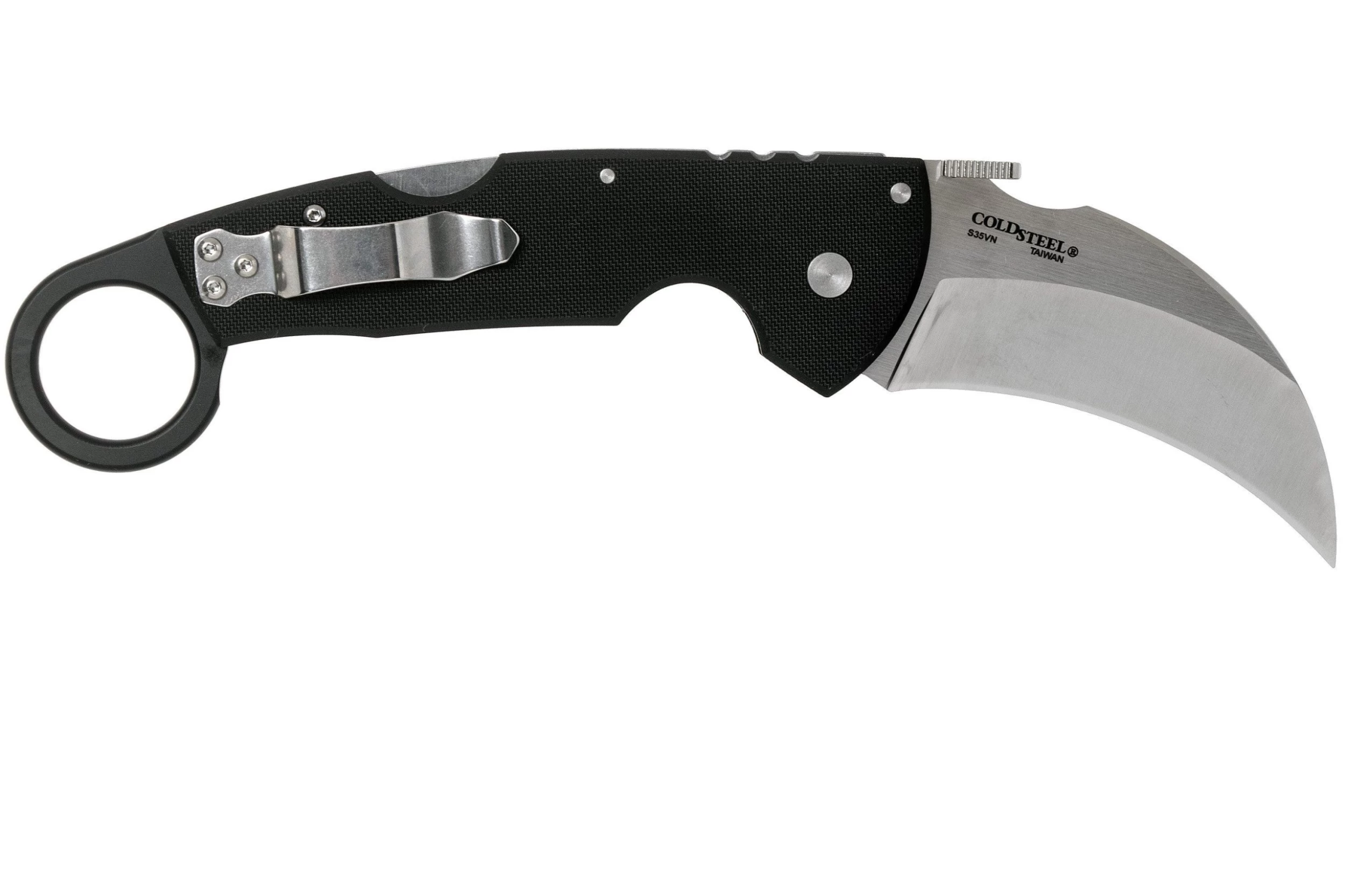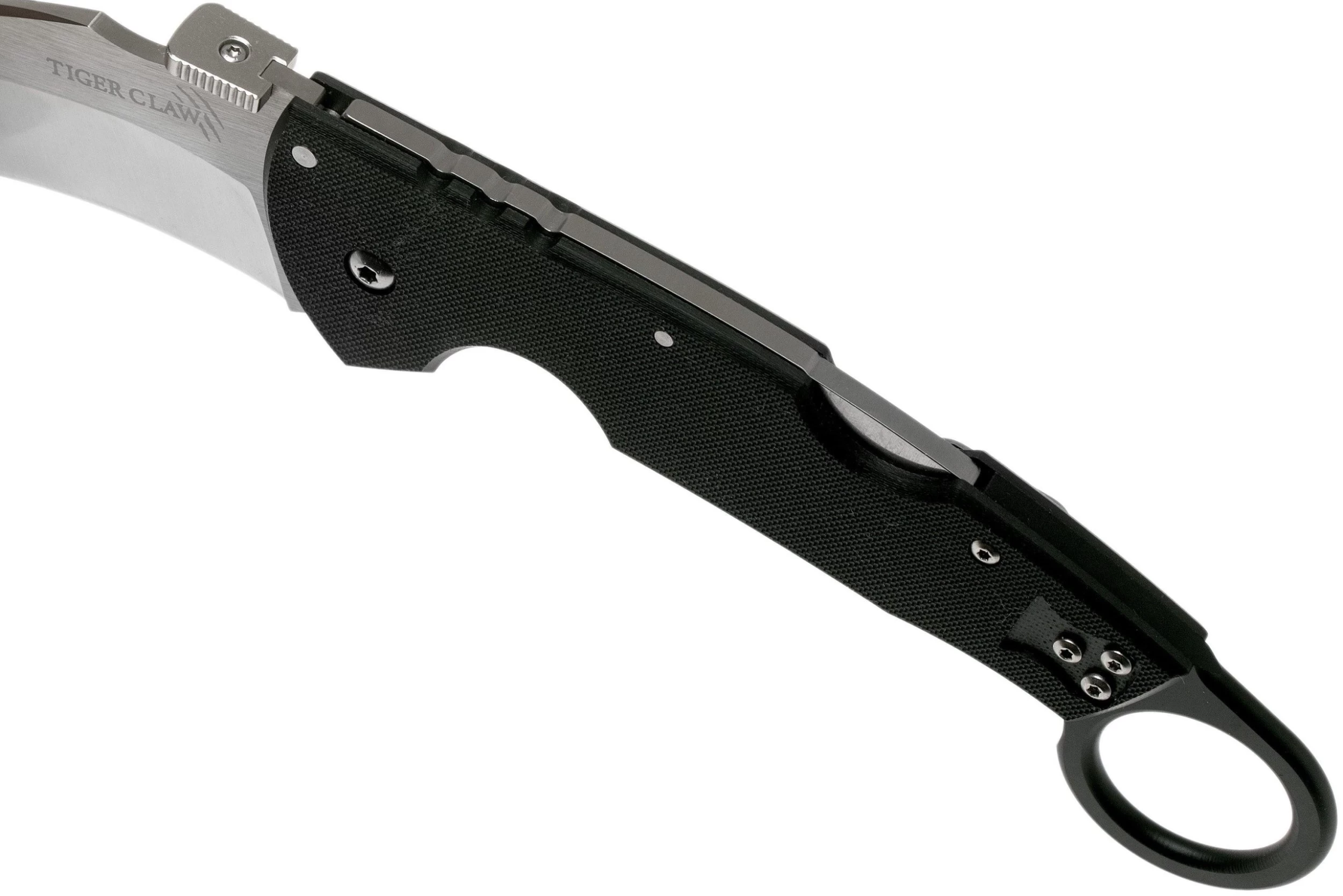 El Cold Steel Tiger Claw 22C es un karambit sólido y de gran tamaño. La hoja curva está afilada por un lado, lo que resulta en un filo peligrosamente afilado. Gracias al uso del acero CPM S35VN, este cuchillo conserva su afilado durante mucho tiempo, incluso después de un uso intensivo. Cuando se abre la hoja se bloquea con el sólido cierre Tri-Ad de Cold Steel. ¡Extremadamente sólido!