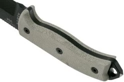 El ESEE Model 5 es un cuchillo de supervivencia sólido con una hoja de acero carbono 1095. El revestimiento en polvo extremadamente sostenible de la hoja ayuda a protegerla de la sensibilidad al óxido del acero carbono. Las increíbles propiedades de uso del acero se aseguran de que lo puedas disfrutar de por vida. La hoja full-tang se ha mejorado con un mango de micarta. Este mango es un poco rugoso, lo que es estupendo para el agarre y la comodidad. El ESEE Model 5 es un cuchillo grande y sólido que puede con trabajos pesados. Comparado con otros modelos ESEE, el ESEE 5 tiene una hoja relativamente gruesa de 6,5 mm. Si las medidas y el peso son demasiado, el Model 4 o el Model 3 son alternativas estupendas y más pequeñas.