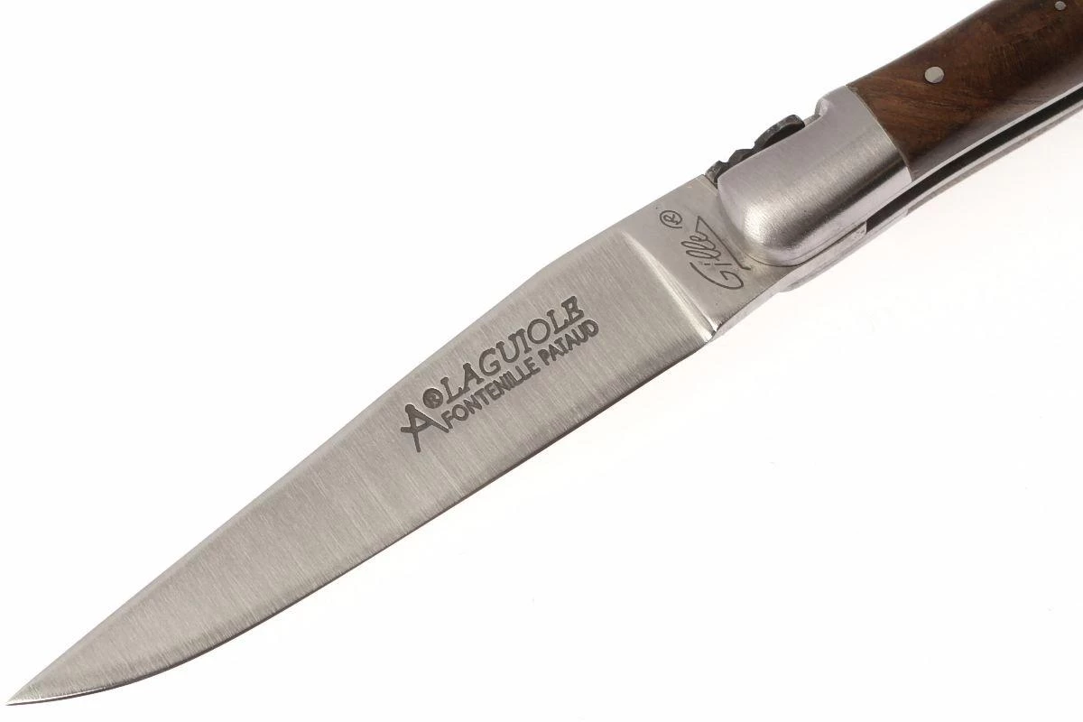 Navaja clásica francesa hecha a mano de Laguiole. Longitud cerrada: 9 cm Realizada con una hoja de acero 14C28N satinado, realzada con un candado. Mango con cachas de madera de nogal.