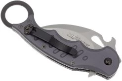 El Fox Mini Karambit es un karambit compacto y plegable. El mango G10, combinado con el anillo para los dedos, proporciona un agarre increíble. La hoja de acero N690Co se entrega muy afilada. Esto es muy conveniente, porque afilar una hoja con un amolado cóncavo es siempre complicado. Existen diferentes opciones para abrir este cuchillo. Puedes utilizar el orificio para el pulgar, el flipper o la onda Emerson. Este es el gancho en la parte posterior de la hoja. Puedes engancharlo a tu bolsillo y así el cuchillo se abrirá automáticamente cuando lo saques del bolsillo.