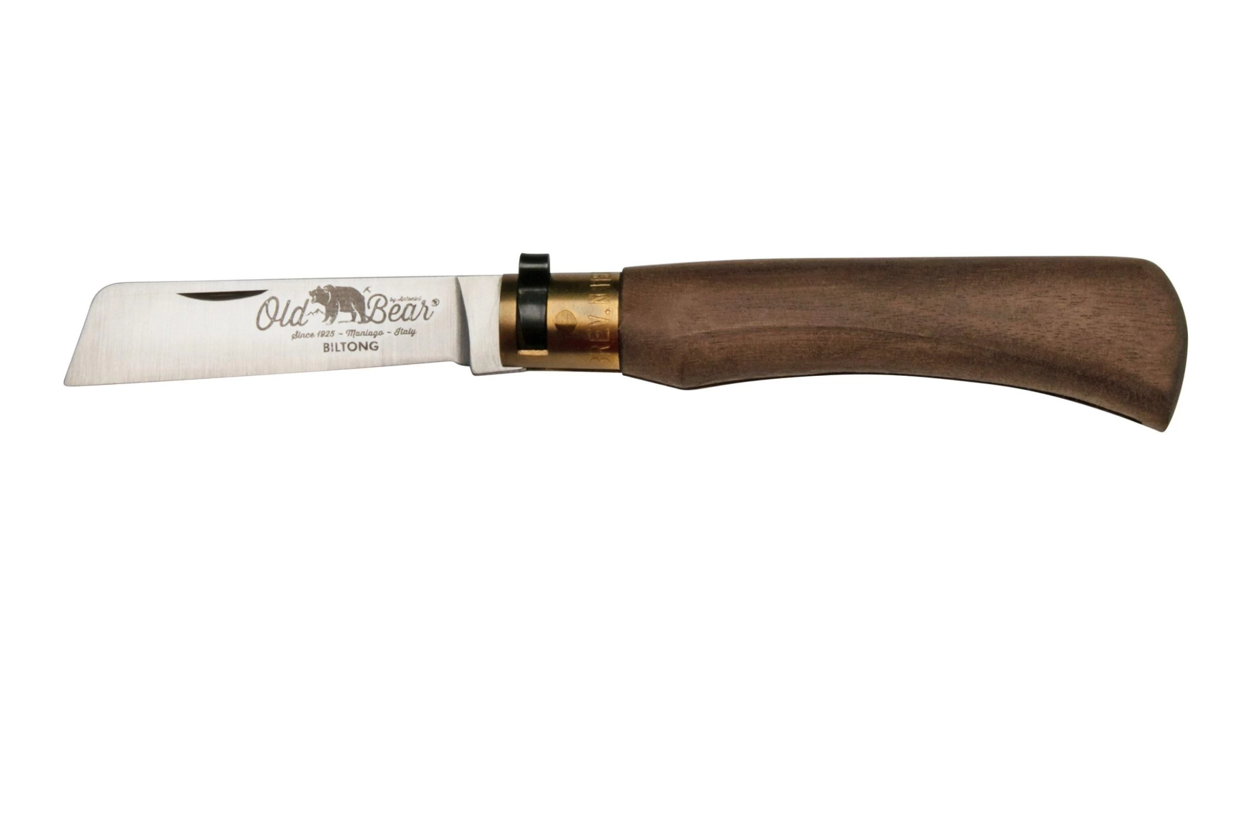 La Old Bear Biltong Walnut es una navaja clásica de Italia. La navaja se diseñó a partir de una versión sudafricana de la navaja (navaja okapi). Por supuesto, es adecuada para cortar biltongs duros y resistentes, pero también es perfecta para cortar cuerdas o embalajes.