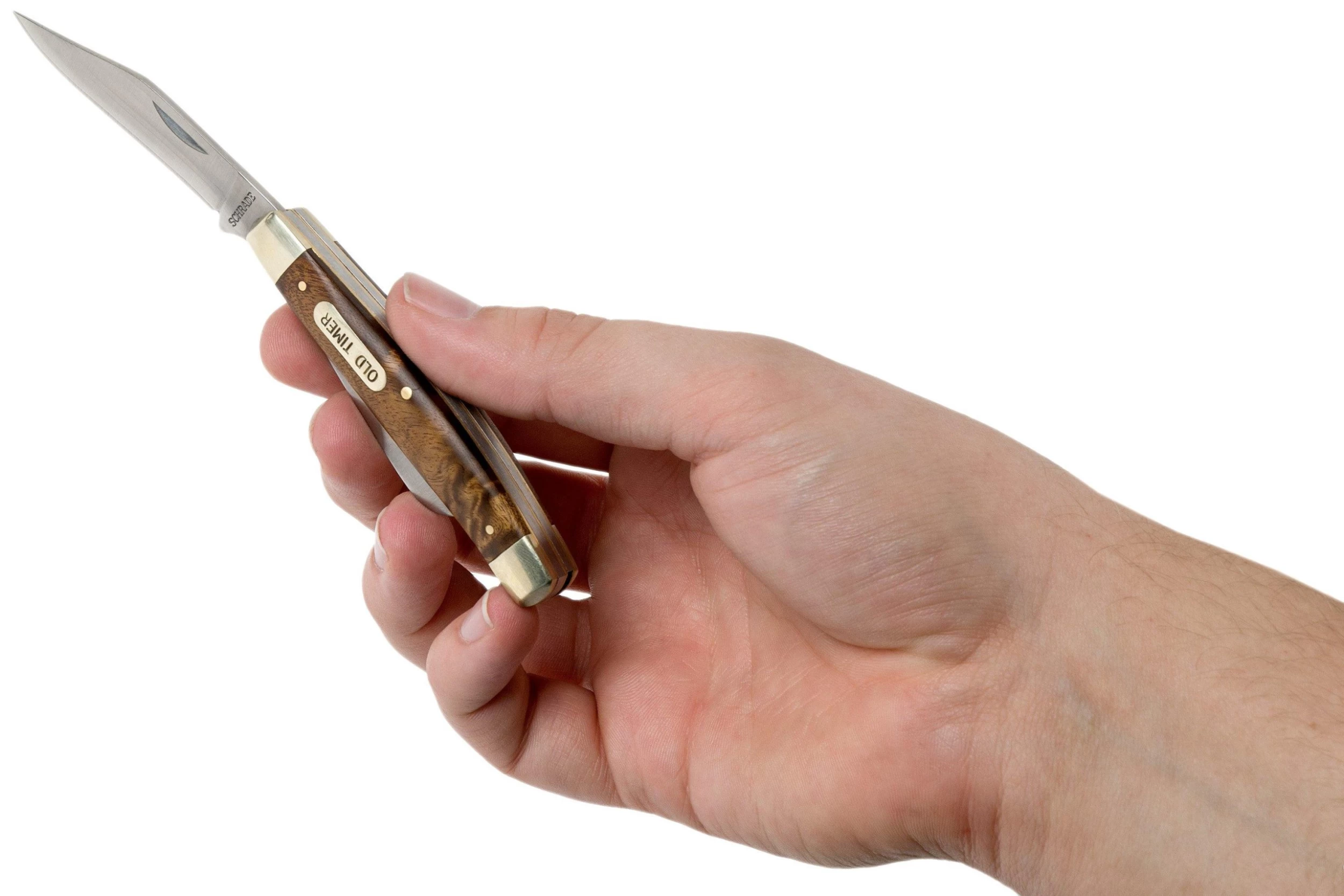 La Old Timer 3″ Middleman 34OTW es una navaja slipjoint de bajo coste, con mango de madera de hierro del desierto. Una compacta tradicional con tres hojas: clippoint, sheepfoot, droppoint. Las hojas se abren con las dos manos y cuando se abren, un slipjoint bloquea la hoja. No hay un bloqueo real, más bien una resistencia. Por ello, estos cuchillos pueden llevarse en muchos lugares.