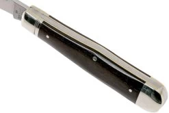 El Robert Klaas 95mm es un impresionante cuchillo de caballero. La hoja tiene forma spearpoint (punta de lanza) de época. El filo unilateral en el lomo de la punta es muy típico de este tipo de cuchillos. No está afilada, pero es maravillosa como elemento de diseño adicional. Además, esta parte fina hace que la punta sea también más fina y perfecta para los trabajos de detalle.