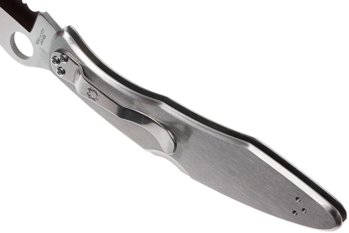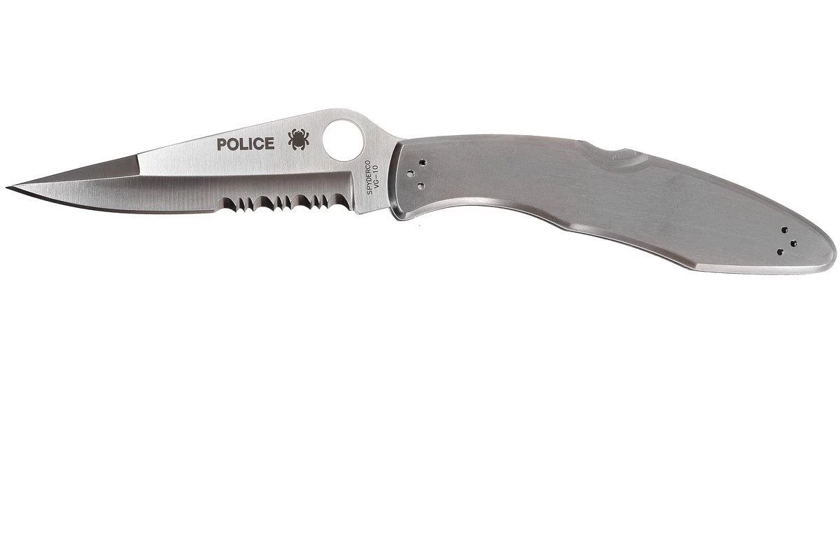 La Spyderco Police es una navaja relativamente grande y cómoda de llevar. Diseñada como un cuchillo, lo más grande posible, que pudiera caber en la funda más pequeña posible. Poco después de su introducción fue adoptada por muchas fuerzas policiales en los Estados Unidos como una de las llamadas armas de reserva. La hoja de punta de clip modificada es fácil de abrir con una mano con el agujero en forma de cometa en la hoja, y se bloquea cuando se abre con un cierre backlock decente y fiable. La hoja está mejorada con un filo parcialmente dentado. El robusto mango de acero inoxidable ofrece múltiples opciones de agarre y las superficies satinadas son perfectas para, por ejemplo, los grabados.